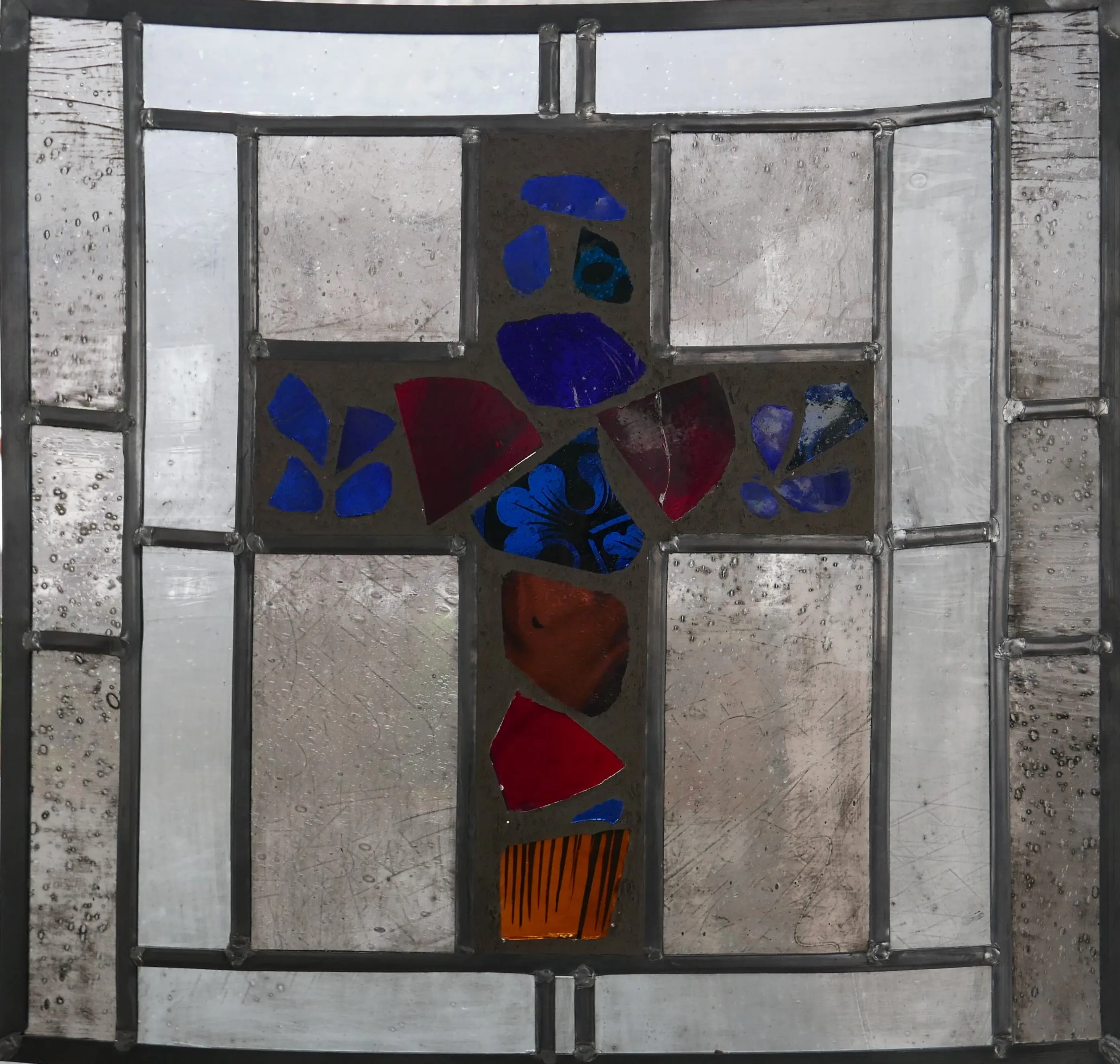 Als Motiv habe ich das Kreuz gewählt, das mosaikartig aus den Buntscherben zusammengefügt ist.Es ist auf einer Trägerglasscheibe in Kreuzform fixiert und mit einer Füllmasse