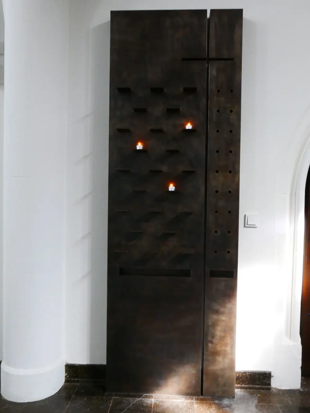 Seit Ostern 2016 hat die evangelische Stadtkirche Groß-Gerau eine Kerzenwand, die von der Nürnberger Künstlerin Meide Büdel, die auch die Prinzipalstücke geschaffen hat, entworfen und realisiert wurde. Wie die Prinzipalstücke zeigt die Kerzenwand aus brüniertem Stahl eine klare und doch ausdrucksstarke Formensprache. Sie bietet dem Besucher der tagsüber geöffneten Kirche die Möglichkeit zur persönlichen Andacht. Er kann eine Kerze entzünden und aufstellen oder auch einen Zettel mit einem Gebet, mit einer Bitte oder einem Dank beschriften und in die Wand stecken. Von der Möglichkeit, ein Licht in die Kerzenwand zu stellen, machen die Menschen vor und nach dem Gottesdienst oder auch, wenn sie an einem Werktag ganz allein in der Kirche sind, regen Gebrauch. Denn das Anzünden einer Kerze und der Blick in das Licht - das ist eine Form der Andacht, die alle Menschen kennen und schätzen, nicht nur gläubige Menschen. Ein Moment der Ruhe und Besinnung entsteht. Durch die Kerzenwand ist die evangelische Stadtkirche erst recht zu einem Ort geworden, der solche Momente möglich macht.